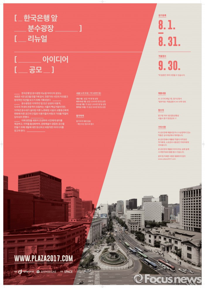 이번 공모전은 다음달 1일부터 한달간 접수를 받는다. 전문가와 일반 시민 등 누구나 참여할 수 있다. 아이디어 공모 대상지는 한국은행 앞 분수대(중구 남대문로 1가 3번지 일대)를 포함한 광장과 인근도로 2548㎡ 규모다.