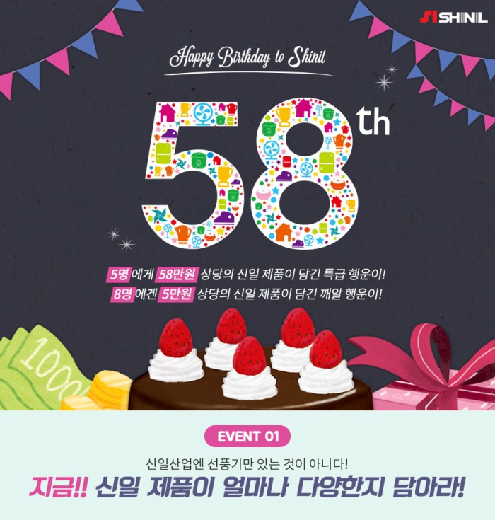 (서울=포커스뉴스) 종합가전 기업 신일산업이 창립 58주년을 기념해 다음달 8일까지 '58만원 장바구니 이벤트'와 '58주년 축하해! 이벤트'를 진행한다고 25일 밝혔다.