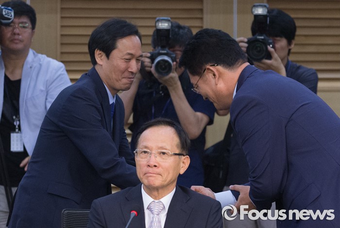 (서울=포커스뉴스) 25일 오전 서울 여의도 국회 의원회관에서 개성공단살리기 국회의원 모임 주최로 열린 개성공단 전면중단, 고도의 정치적 행위 논리 정당한가? 세미나에 참석한 우상호(왼쪽) 더불어민주당 원내대표와 전당대회 출마를 선언한 송영길 의원이 인사하고 있다.