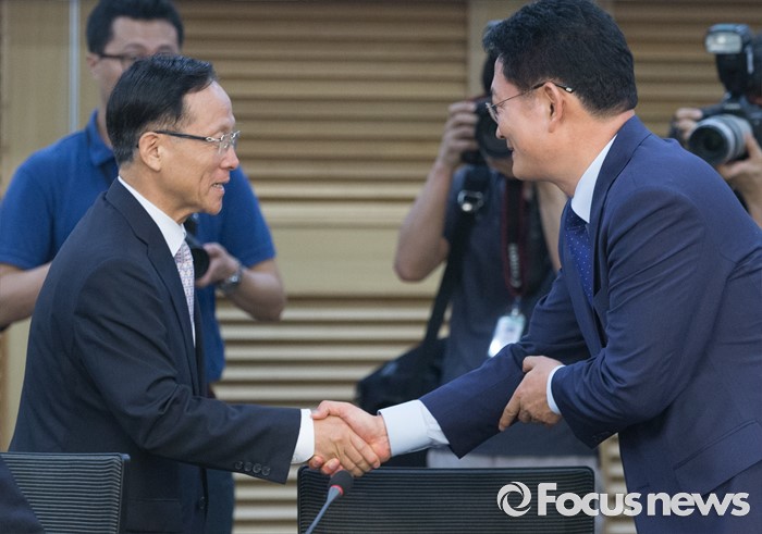 (서울=포커스뉴스) 25일 오전 서울 여의도 국회 의원회관에서 개성공단살리기 국회의원 모임 주최로 열린 개성공단 전면중단, 고도의 정치적 행위 논리 정당한가? 세미나에 참석한 이수혁(왼쪽) 더불어민주당 한반도경제통일위원장과 전당대회 출마를 선언한 송영길 의원이 인사하고 있다.