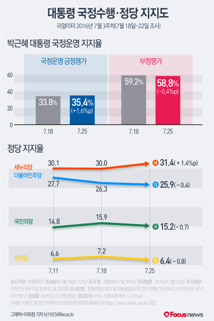 (서울=포커스뉴스) 25일 발표한 여론조사 기관 리얼미터 2016년 7월 3주차 주간집계에 따르면 박근혜 대통령의 국정수행 지지율이 2주 연속 상승한것으로 나타났다. 주요 정당 지지도는 새누리당의 지지율이 상승한 반면 야3당은 약세를 기록했다.