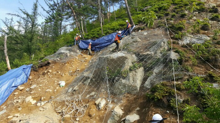 강태구 코레일 시설기술단장은 "올여름 국지적인 집중 호우가 예상된다는 예보에 따라 지형과 기후에 맞춰 탄력적인 대응체계를 마련하겠다"며 "태풍을 비롯 기상이변에도 대비하기 위해 시설과 시스템을 빈틈없이 점검 하겠다"고 밝혔다.코레일 직원들이 낙석 등을 대비해 비탈면 보강공사를 하고 있다.<사진제공=코레일>