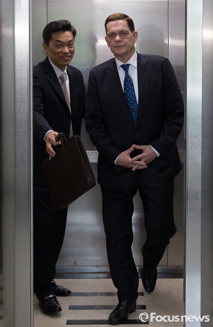 (인천=포커스뉴스) 요하네스 타머(오른쪽) 아우디폭스바겐 사장과 정재균 부사장이 25일 오전 인천 서구 국립환경과학원에서 열린 차량 인증 조작 관련 환경부 청문회를 마친 후 청문회장을 나서고 있다.