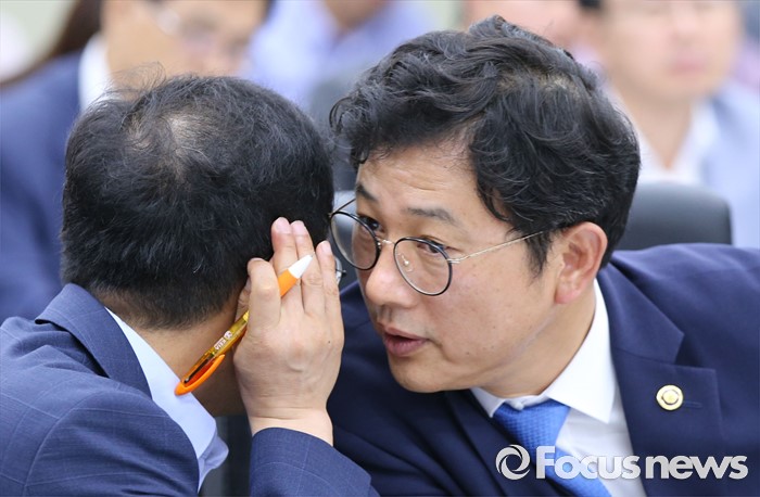 (세종=포커스뉴스) 25일 오전 세종시 정부세종청사 국회회의실에서 열린 환경부·고용노동부·국립환경과학원·안전보건공단에 대한 국회 가습기살균제 특조위 현장조사에서 이정섭 환경부 차관이 직원과 귀엣말을 하고 있다.