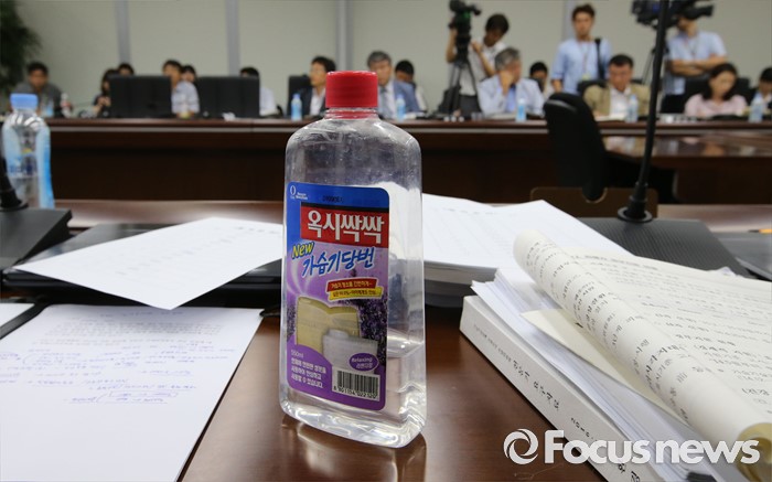 (세종=포커스뉴스) 25일 오전 세종시 정부세종청사 국회회의실에서 열린 환경부·고용노동부·국립환경과학원·안전보건공단에 대한 국회 가습기살균제 특조위 현장조사에서 옥시싹싹 제품이 보이고 있다.