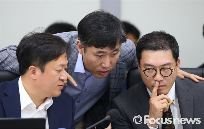 (세종=포커스뉴스) 25일 오전 세종시 정부세종청사 국회회의실에서 열린 환경부·고용노동부·국립환경과학원·안전보건공단에 대한 국회 가습기살균제 특조위 현장조사에서 하태경 새누리당 간사가 외부 전문 위원과 논의하고 있다.