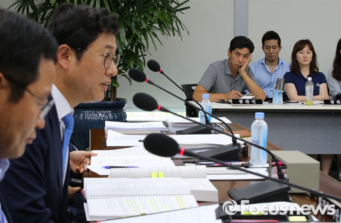 (세종=포커스뉴스) 25일 오전 세종시 정부세종청사 국회회의실에서 열린 환경부·고용노동부·국립환경과학원·안전보건공단에 대한 국회 가습기살균제 특조위 현장조사에서 참관인으로 참석한 피해자 가족들이 이정섭 환경부 차관의 답변을 바라보고 있다.