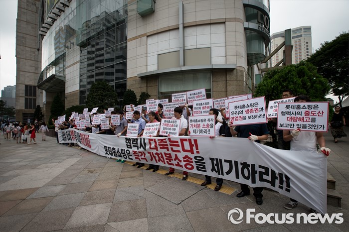 (서울=포커스뉴스) 25일 오전 서울 중구 롯데백화점 앞에서 롯데홈쇼핑 협력사 비상대책위원회원들이 생존권 보장을 촉구하며 집회를 열고 있다.