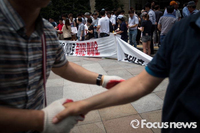 (서울=포커스뉴스) 25일 오전 서울 중구 롯데백화점 앞에서 롯데홈쇼핑 협력사 비상대책위원회원들이 생존권 보장을 촉구하며 집회를 열고 있다.