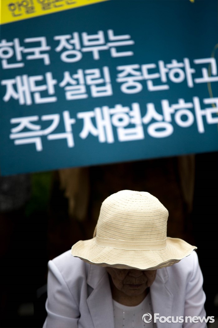 (서울=포커스뉴스) 25일 오전 서울 종로구 정부서울청사 앞에서 화해·치유재단 설립 강행하는 정부를 규탄하는 정대협(한국정신대문제대책협의회) 및 일본군 위안부 피해자 할머니들의 집회가 열리고 있다.