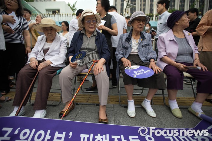 (서울=포커스뉴스) 25일 오전 서울 종로구 정부서울청사 앞에서 화해·치유재단 설립을 강행하는 정부를 규탄하는 정대협(한국정신대문제대책협의회) 및 일본군 위안부 피해자 할머니들의 집회가 열리고 있다.(왼쪽부터) 이옥선, 이용수, 김복동, 길원옥 할머니.