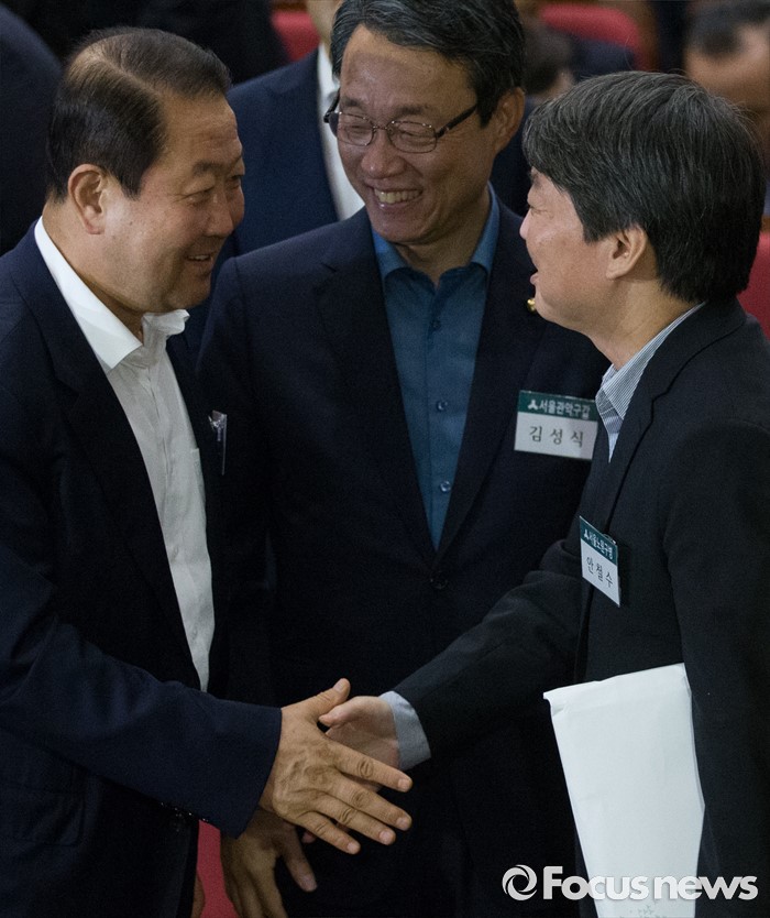 (서울=포커스뉴스) 25일 오후 서울 여의도 국회 의원회관에서 열린 국민의당 지역위원장 임명장 수여식 및 연석회의에 참석한 안철수(오른쪽부터) 전 상임공동대표, 김성식 정책위의장, 박주선 국회 부의장이 인사하고 있다.
