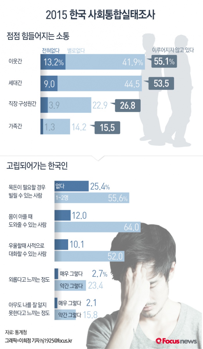 한국행정연구원이 지난해 8월17일부터 10월9일까지 조사하고 같은해 12월31일에 통계청이 발표한 자료 '사회통합실태조사 - 사회적 소통 부문(2015)'은 한국인들 사이의 '소통'이 얼마나 부족해졌는지를 보여주고 있다.