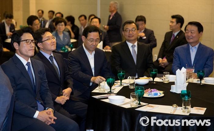 (서울=포커스뉴스) 전당대회 대표최고위원 출마를 선언한 정병국(왼쪽부터), 김용태, 주호영, 이정현, 한선교 새누리당 의원이 25일 오후 서울 여의도 중소기업중앙회관에서 열린 중앙위원회 전국시도당연합회 월례회 행사에 참석해 생각에 잠겨 있다.