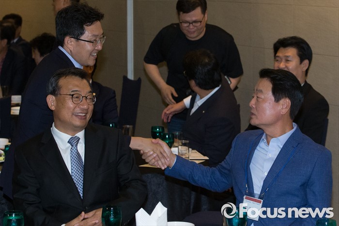 (서울=포커스뉴스) 전당대회 대표최고위원 출마를 선언한 김용태(왼쪽부터), 이정현, 한선교 새누리당 의원이 25일 오후 서울 여의도 중소기업중앙회관에서 열린 중앙위원회 전국시도당연합회 월례회 행사에 참석해 인사하고 있다.