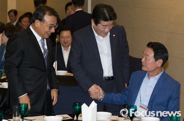 (서울=포커스뉴스) 전당대회 대표최고위원 출마를 선언한 이정현(왼쪽), 한선교(오른쪽) 새누리당 의원이 25일 오후 서울 여의도 중소기업중앙회관에서 열린 중앙위원회 전국시도당연합회 월례회 행사에 참석해 최고위원 출마를 선언한 강석호 의원과 인사하고 있다.