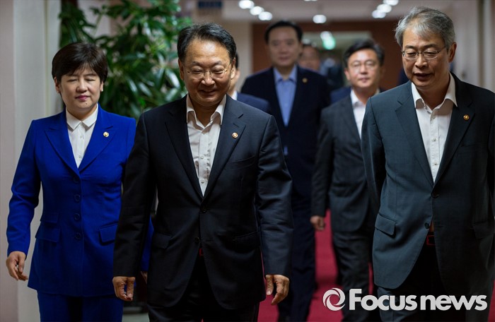 (서울=포커스뉴스) 26일 오전 정부서울청사에서 열린 국무회의에 유일호(맨 앞) 경제부총리 겸 기획재정부 장관을 비롯한 국무위원들이참석하고 있다.