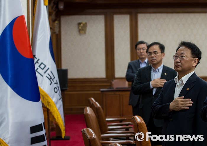 (서울=포커스뉴스) 26일 오전 정부서울청사에서 열린 국무회의에 참석한 유일호(맨 오른쪽) 경제부총리 겸 기획재정부 장관을 비롯한 국무위원들이 국민의례를 하고 있다.