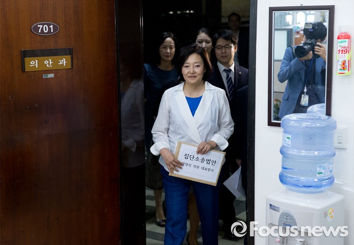 (서울=포커스뉴스) 박영선 더불어민주당 의원과 관계자들이 26일 오전 서울 여의도 국회 의안과에서 집단소송법 제정 법안을 제출하고 있다. 박 의원은 앞서 기자회견을 통해 "미국에만 거액 배상을 합의한 폭스바겐측의 행태는 현행 민사소송법 한계를 드러낸 것으로 우리 국민들의 적절한 피해배상과 신속한 권리구제를 위해 징벌적 배상제 도입과 함께 집단소송제 도입이 시급해 대표발의했다"고 전했다.