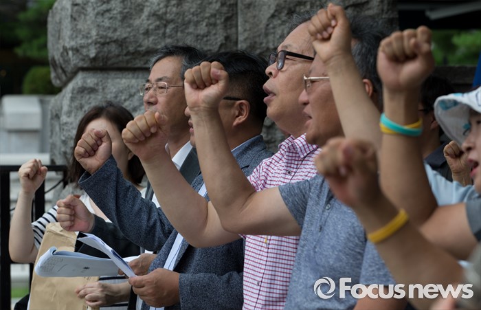 (서울=포커스뉴스) 26일 오전 서울 종로구 헌번법재판소 앞에서 민주사회를 위한 변호사모임과 한국사국정화저지네트워크가 국정화 고시 효력정지 가처분 제기 기자회견을 하고 있다.