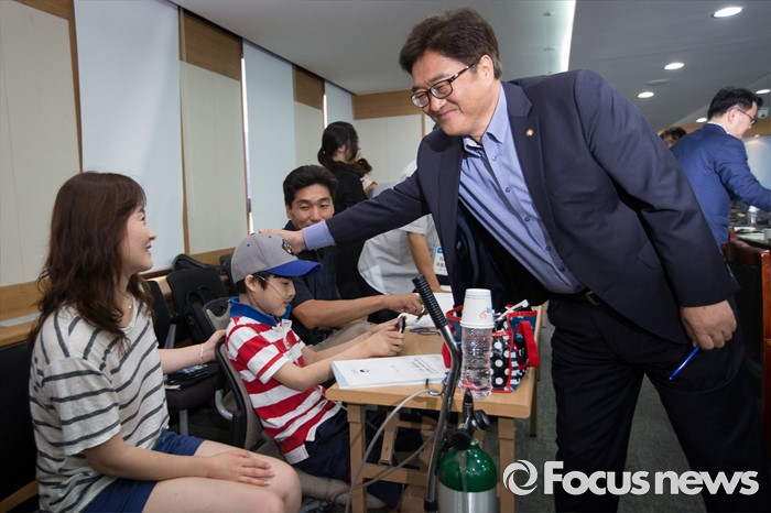 | △ 가습기 살균제 피해자 어린이와 인사하는 우원식 |