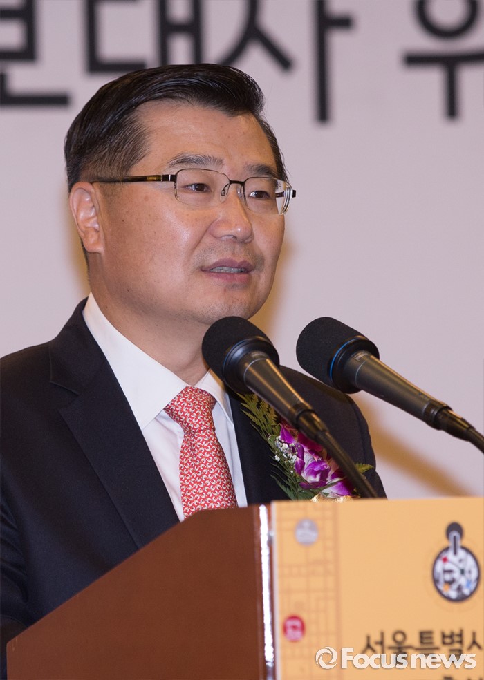 (서울=포커스뉴스) 26일 오전 서울 종로구 세종문화회관에서 열린 '2016 전국기능경기대회 서울특별시 선수단 결단식 및 홍보대사 위촉식'에 참석한 류경기 서울시 행정1부시장이 인사말을 하고 있다.