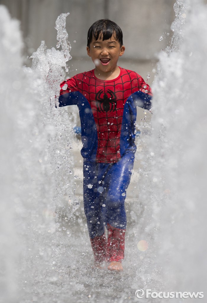 (서울=포커스뉴스) 무더위가 지속되고 있는 26일 오전 광화문광장 분수대에서 한 아이가 물놀이를 즐기고 있다.
