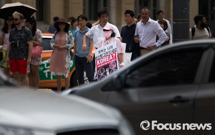 (서울=포커스뉴스) 26일 오전 서울 종로구 광화문광장에서 세이브 코리언 독스 회원이 개고기 문화를 반대하는 피켓을 들고 있다.