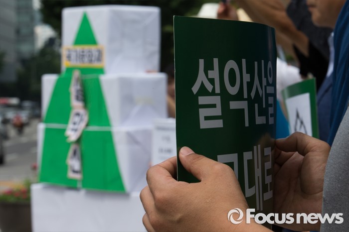 (서울=포커스뉴스) 26일 오전 서울 광화문광장에서 열린 설악산 케이블카 반대 기자회견에 참석한 설악산국립공원지키기 국민행동 회원들이 케이블카 취소 촉구 피켓을 들고 있다.