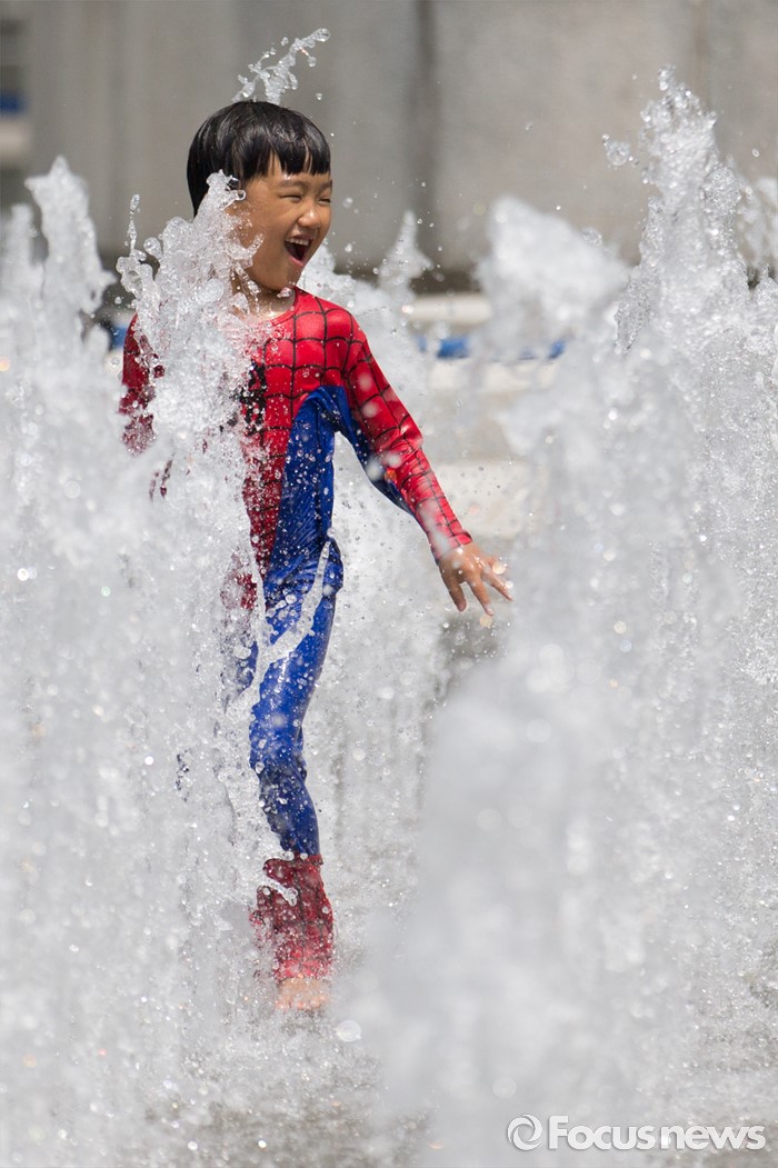 (서울=포커스뉴스) 무더위가 지속되고 있는 26일 오전 광화문광장 분수대에서 한 아이가 물놀이를 즐기고 있다.