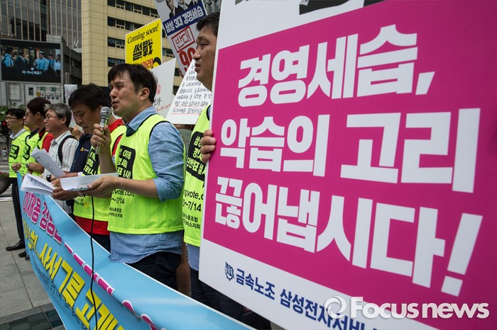 (서울=포커스뉴스) 26일 오전 서울 종로구 광화문광장에서 열린 삼성 경영권 세습 공개토론 제안 기자회견에 참석자들이 삼성의 경영세습을 비판하는 내용이 적힌 손 피켓을 들고 있다.