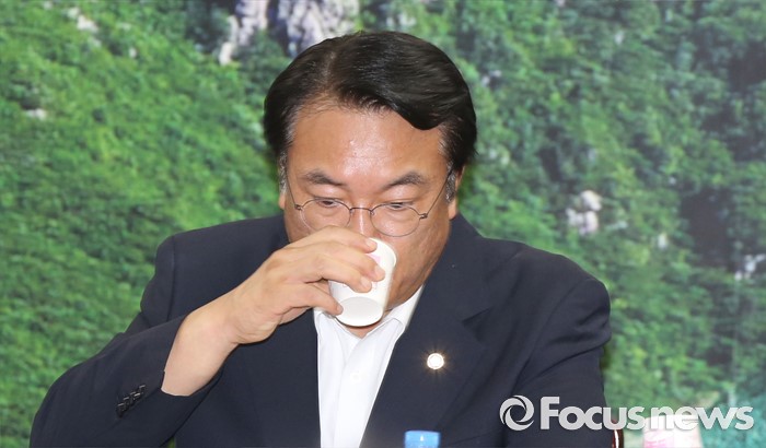 (성주=포커스뉴스) 26일 오전 경북 성주군청을 찾은 정신석 새누리당 원내대표와 지도부들이 성주군민들과 간담회에서 목을 축이고 있다.