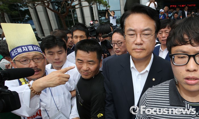 (성주=포커스뉴스) 26일 오전 경북 성주군청을 찾은 정신석 새누리당 원내대표와 지도부들이 성주군민들에게 항의 받고 있다.