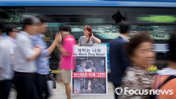 (서울=포커스뉴스) 26일 오후 서울 종로구 광화문광장에서 영국에서 온 세이브 코리언 독스 회원이 개고기 문화를 반대하는 피켓을 들고 있다.