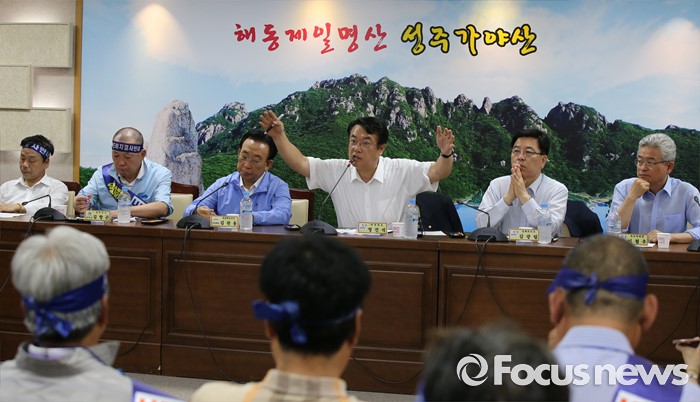 (성주=포커스뉴스) 26일 오전 경북 성주군청을 찾은 정신석 새누리당 원내대표가 성주군민들과 간담회에서 질문에 답변하고 있다.