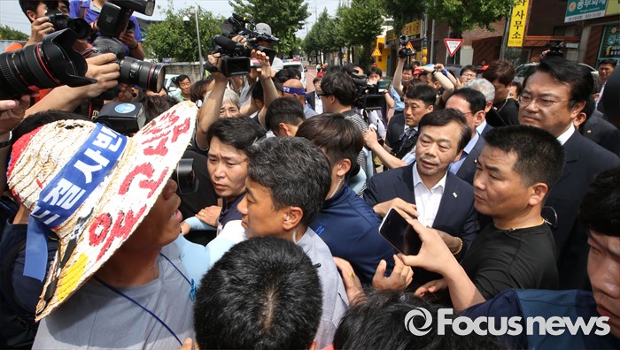 (성주=포커스뉴스) 26일 오전 경북 성주군청을 찾은 정신석 새누리당 원내대표와 지도부들이 성주군민들에게 항의 받고 있다.