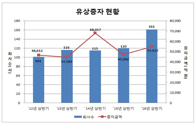 26일 한국예탁결제원에 따르면 올 상반기 상장사의 유상증자 회사수는 161개사로, 지난해 같은 기간보다 34.2% 증가했다.