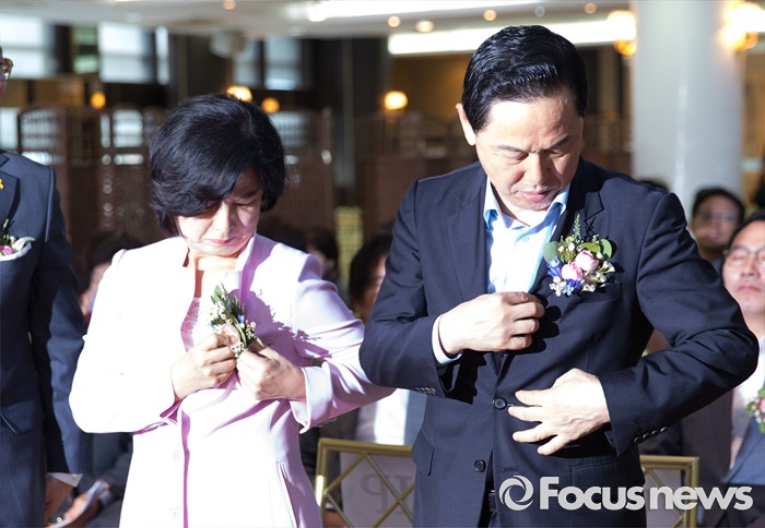 | △ 가슴에 꽃 다는 김상곤과 추미애 |