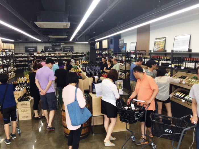 말복인 다음달 16일까지는 삼계탕 등 복날 즐겨먹는 음식에 잘 어울리는 와인의 할인전을 진행한다. 행사기간 동안 이름에 '복'자가 들어 있거나 복날 당일 해적룰렛 게임에 당첨되면 와인(르아미 드라이레드) 1병을 무료 증정한다.창고형 와인도매점인 데일리와인 매장 내부 모습.<사진제공=데일리와인>