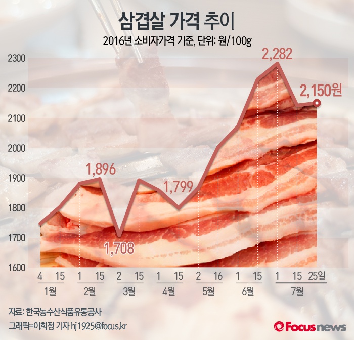 (서울=포커스뉴스) 휴가철을 맞아 삼겹살 가격이 급등하고 있다. 한국농수산식품유통공사의 자료에 따르면 7월 25일 기준 삼겹살 100g의 소비자가격은 2,150원으로 3월 2일 소비자가격(1,708원)대비 25.8% 증가했다.