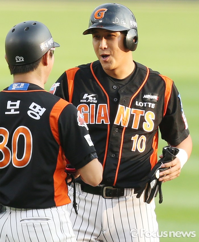 (서울=포커스뉴스) 26일 서울 잠실구장에서 열린 2016 프로야구 롯데-LG 경기 1회초 1사 1,2루에서 좌익수 왼쪽으로 빠지는 1타점 2루타를 친 롯데 황재균이 정보명 코치와 밝은 표정으로 대화하고 있다. 2루에서 기뻐하고 있다.