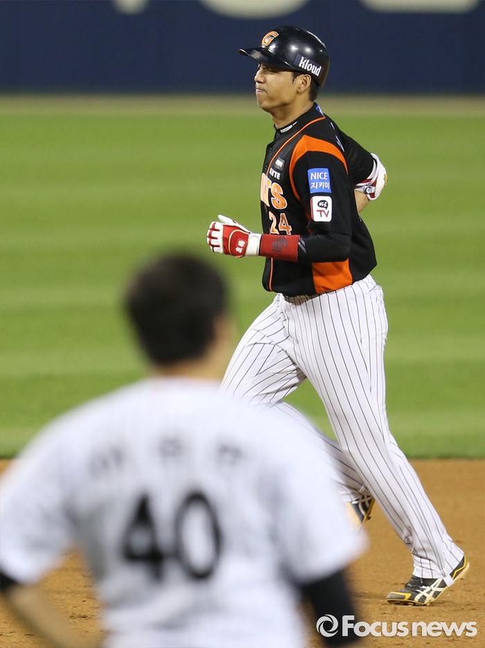 (서울=포커스뉴스) 26일 서울 잠실구장에서 열린 2016 프로야구 롯데-LG 경기 4회초 1사후 롯데 김문호가 우월 만루홈런을 치고 베이스를 돌고 있다. LG 투수 이승현이 김문호의 런닝을 지켜보고 있다.