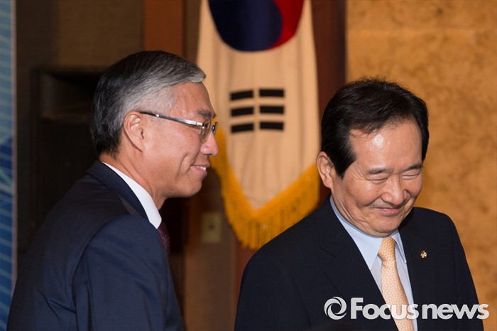 (서울=포커스뉴스) 정세균(오른쪽) 국회의장과 추궈홍 주한중국대사가 26일 오후 서울 중구 롯데호텔에서 열린 '한중 지도자 친선의 밤' 행사에 참석해 인사를 나눈 뒤 자리로 향하고 있다.
