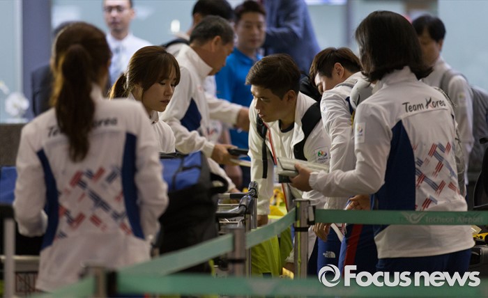 (인천공항=포커스뉴스) 남미에서 최초로 열리는 제31회 브라질 리우데자네이루 하계올림픽에 참가하는 대한민국 국가대표팀 선수들이 26일 오후 인천국제공항에서 출국 전 짐 정리를 하고 있다.