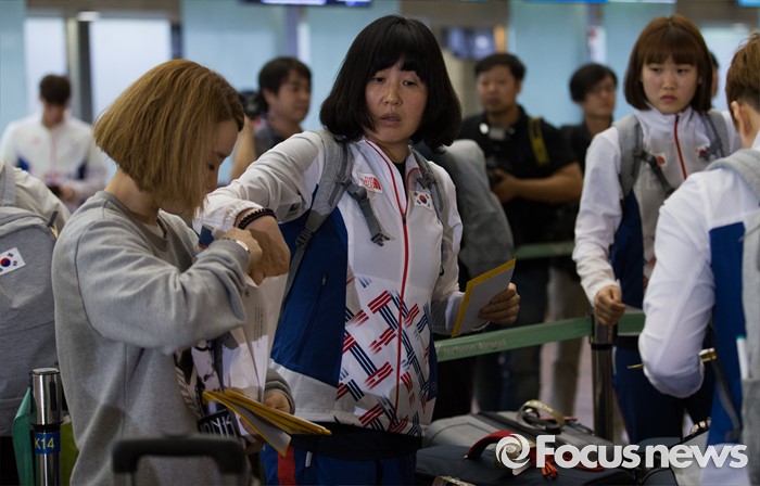 (인천공항=포커스뉴스) 남미에서 최초로 열리는 제31회 브라질 리우데자네이루 하계올림픽에 참가하는 오영란 대한민국 핸드볼 국가대표팀 선수가 26일 오후 인천국제공항에서 후배들과 대화하고 있다.
