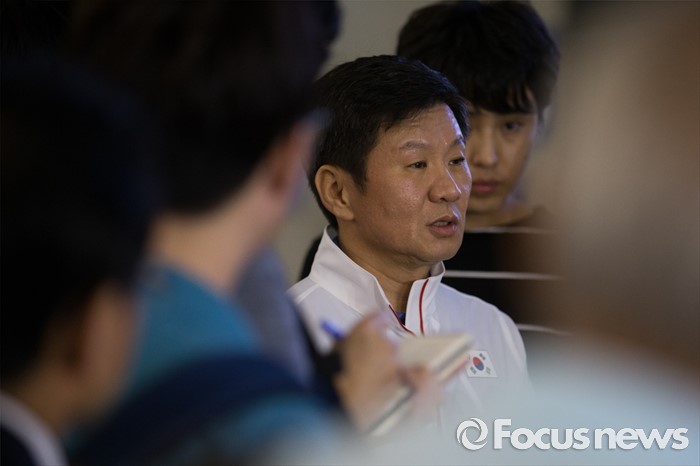 (인천공항=포커스뉴스) 남미에서 최초로 열리는 제31회 브라질 리우데자네이루 하계올림픽 대한민국 선수단을 이끄는 정몽규 선수단장이 26일 오후 인천국제공항에서 출국 전 취재진 질문에 답변하고 있다.