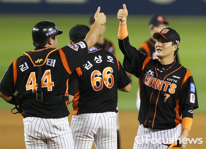 (서울=포커스뉴스) 26일 서울 잠실구장에서 열린 2016 프로야구 롯데-LG 경기에서 LG에 12-10으로 2점차 승리한 롯데 선수들이 마운드에 모여 엄지 손가락을 치켜 세우고 함꼐 기뻐하고 있다.