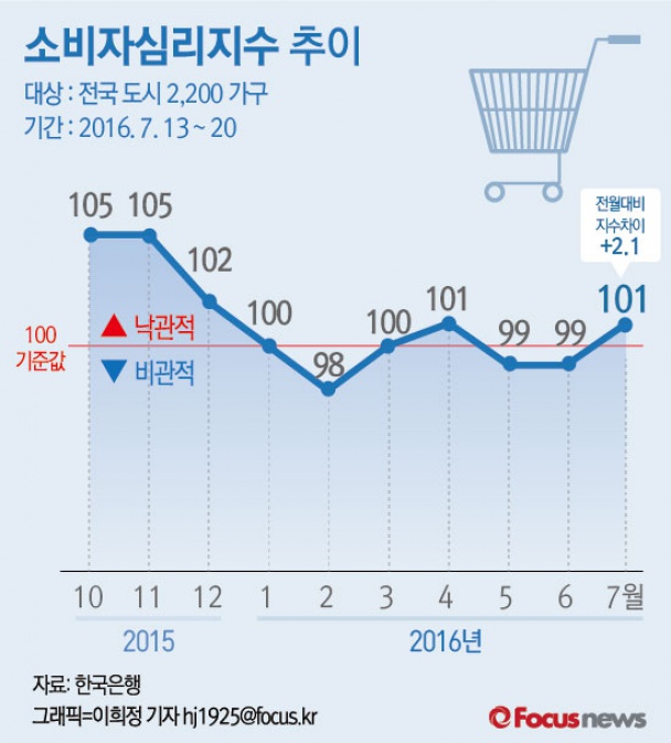 (서울=포커스뉴스) 27일 한국은행이 발표한 '2016년 7월 소비자동향조사 결과'에 따르면 7월 소비자심리지수(CCSI)는 101로 3개월만에 가장 높은 수준을 보였다.