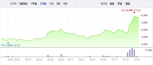 에임하이는 27일 오전 9시35분 현재 전 거래일 대비 1.76%(110원) 하락한 6140원에 거래되고 있다. 에임하이는 21일과 22일, 그리고 26일에도 29.89%, 6.44%, 13.35%의 상승폭을 기록했다.