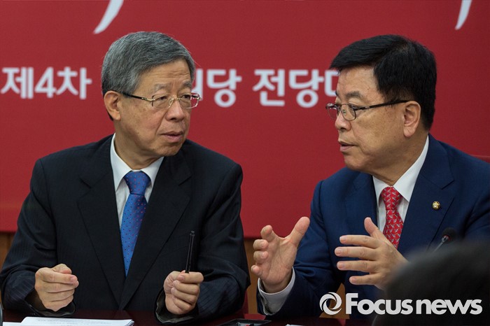 (서울=포커스뉴스) 김희옥(왼쪽) 새누리당 혁신비상대책위원장과 김광림 정책위의장이 27일 오전 서울 여의도 새누리당사에서 열린 혁신비상대책위원회의에 참석해 대화 하고 있다.